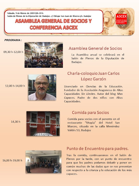 Posteriormente, a las 12,00 h, contaremos con la presencia de Juan Carlos López Garzón, que nos ofrecerá una charla coloquio en la que bajo el título “Altas Capacidades en el aula. Sí, se puede”, podremos conocer de qué manera se puede atender de forma más efectiva a estos alumnos en el aula. Juan Carlos López Garzón, es Licenciado en Ciencias de la Educación. Fundador de la Asociación Aragonesa de Altas Capacidades “Sin Límites”. Autor del libro “Didáctica para Alumnos de Altas Capacidades”, así como del famoso blog “Mas Capaces” (http://mascapaces.net/ ). Además, Juan Carlos es padre de dos niños uno de ellos con Altas Capacidades. Juan Carlos aunque en su día fundó la asociación citada, actualmente está a disposición de la Plataforma de Apoyo a las AACC y en la Asociación Aragonesa de Psicopedagogía.